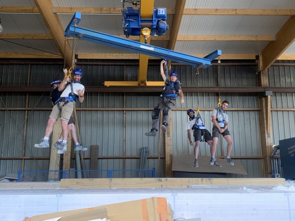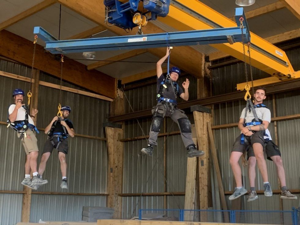 Chez Charpente & Création, on allie l’utile à l’agréable ! Nous ne sommes pas beaux, là, suspendus à notre palonnier par notre pont roulant abus 4T ? Plutôt Mission Impossible ou Indiana Jones d’après vous?